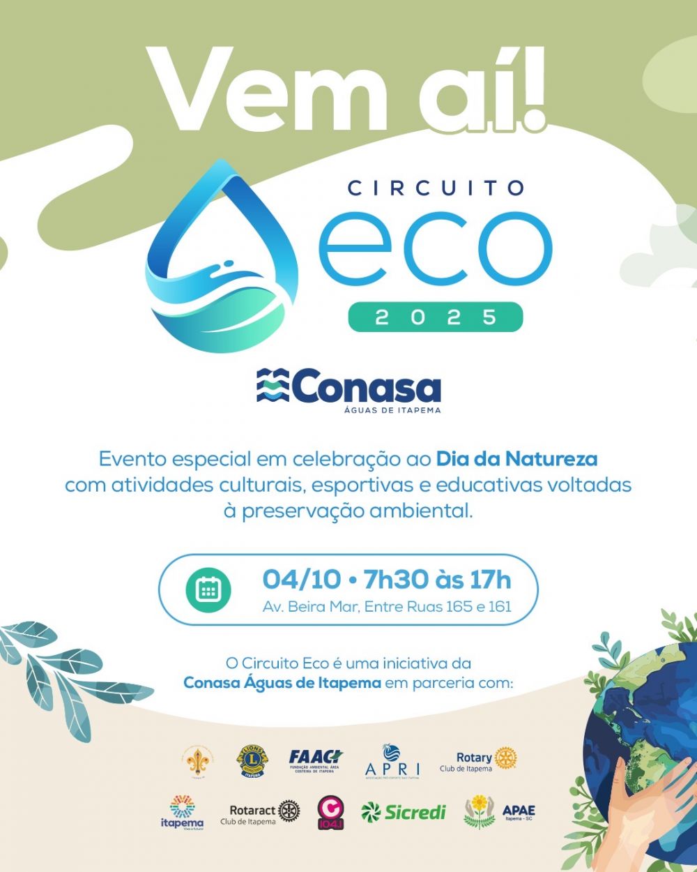 A Prefeitura de Itapema, em parceria com a Conasa Águas de Itapema e diversas instituições locais, promove neste sábado (04/10) o Circuito Eco 2025, um evento em alusão ao Dia da Natureza. A programação ocorre das 7h30 às 17h, na Avenida Beira Mar, entre as Ruas 165 e 161, e convida toda a comunidade para um dia de atividades culturais, esportivas e educativas voltadas à preservação ambiental e ao incentivo de práticas sustentáveis.