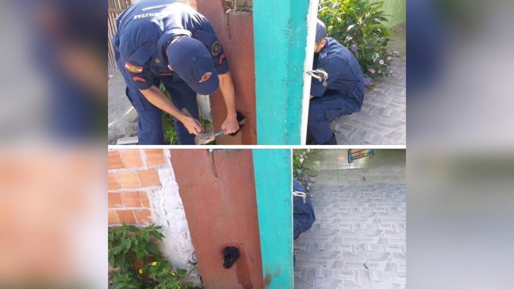 atender uma ocorrência no bairro Samambaial, em Itapoá. No local os bombeiros encontraram o cãozinho com a cabeça presa em um cano de 100 milímetros, onde fica o medidor de água.