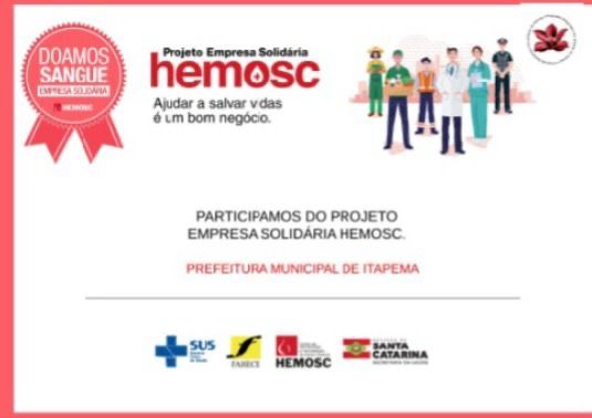 A Prefeitura de Itapema recebeu o Certificado de Empresa Solidária, concedido pelo Hemocentro de Santa Catarina (HEMOSC), em reconhecimento ao apoio e incentivo à doação de sangue. A honraria faz parte do Projeto Empresa Solidária, que busca sensibilizar instituições públicas e privadas sobre a importância da doação, estimulando a formação de multiplicadores e fortalecendo a integração entre a comunidade e o Hemocentro.
