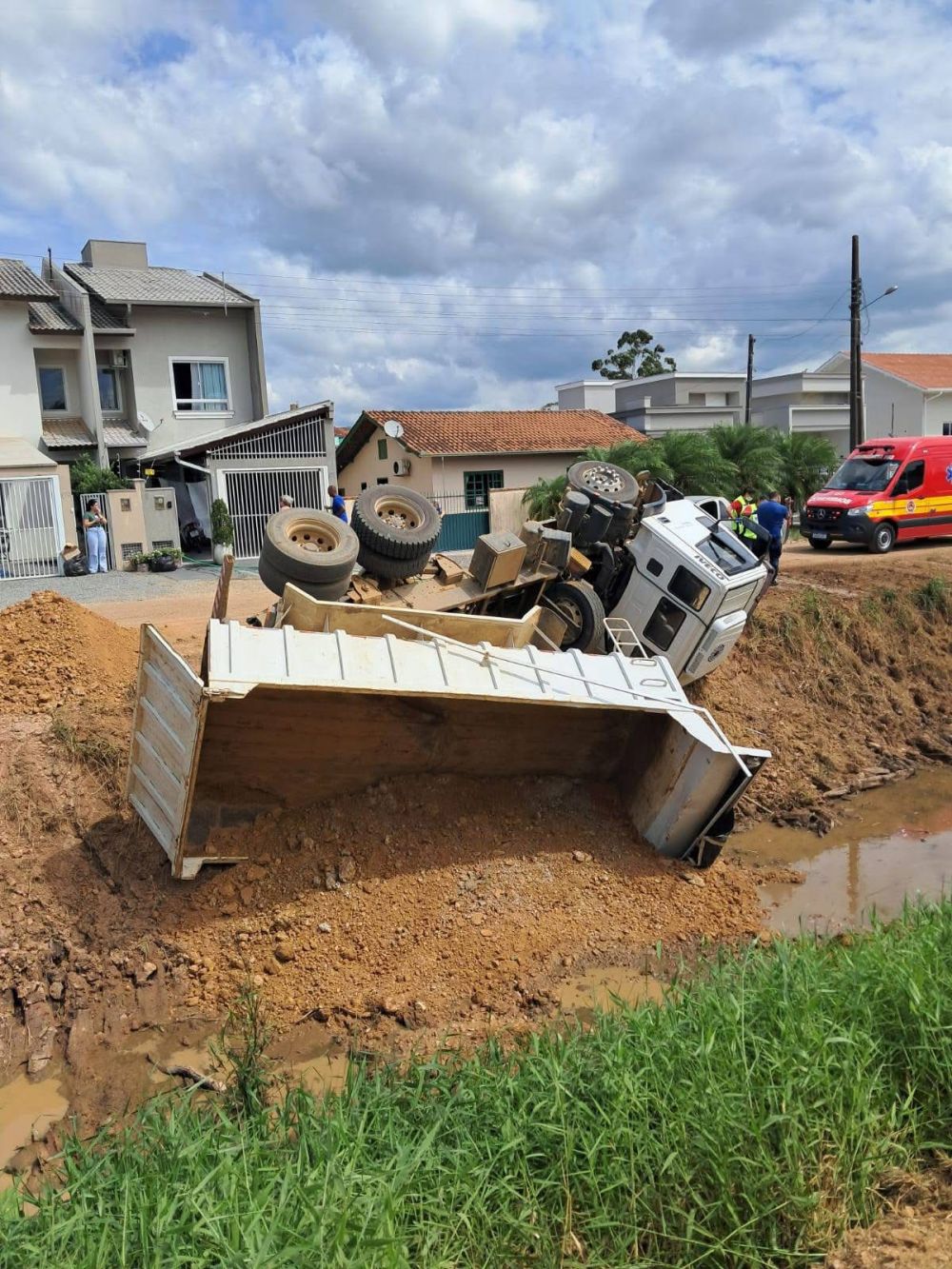 De acordo com as informações, o veículo estava com o basculante inclinado quando perdeu estabilidade e caiu na vala.