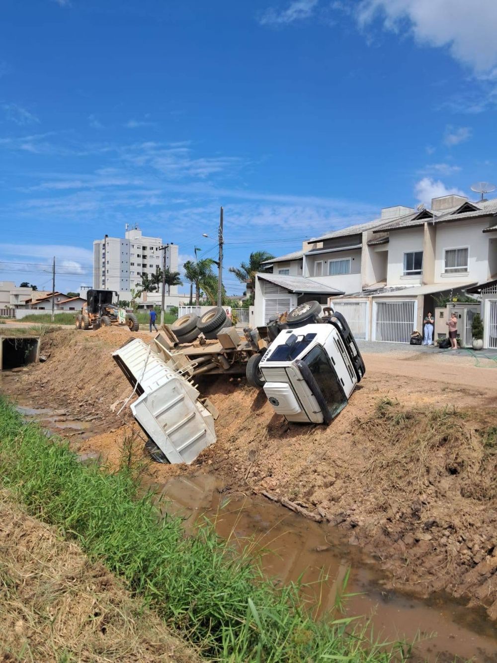Na terça-feira, 17/03, uma caçamba utilizada pela prefeitura acabou tombando dentro de uma vala no Centro de Canelinha. O caso ocorreu por volta das 13h39, na Rua Manoel Francisco Corrêa, nas proximidades do quartel dos Bombeiros.