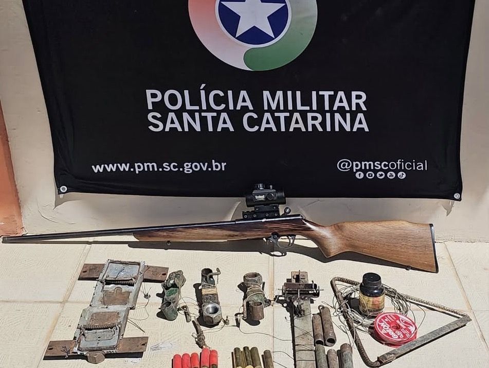 Na vistoria, os agentes apreenderam um rifle calibre .22 equipado com luneta, além de munições de diversos calibres, espoletas, armadilhas e materiais artesanais usados na atividade ilegal. Próximo ao galpão, também foram encontrados restos de um animal silvestre, possivelmente um javali, abatido recentemente.