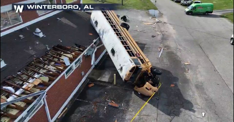 Tornados deixam rastro de destruição e jogam ônibus escolar sobre telhado de escola no Alabama
