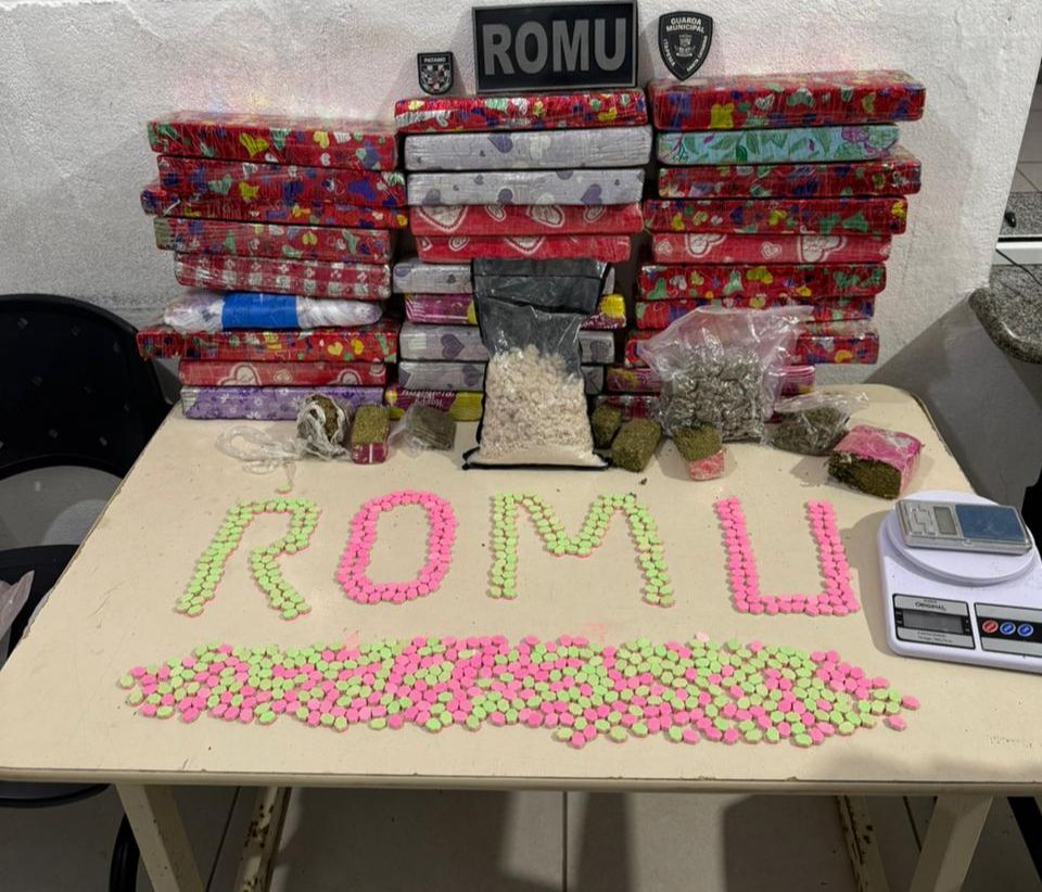 A Romu seguiu até o imóvel indicado e realizou buscas no local. Lá foram encontrados cerca de 23 kg de maconha, 1 kg de substância semelhante a MDMA, aproximadamente 700 comprimidos parecidos com ecstasy, 320 papelotes de LSD, além de balanças de precisão, materiais para fracionamento e um caderno com anotações típicas do tráfico.